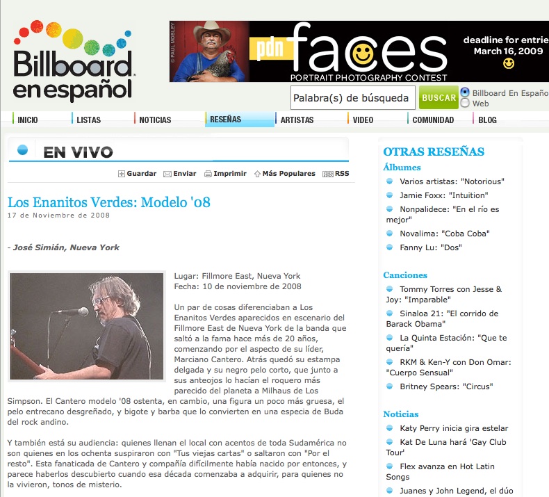 Here’s the link to my most cherished piece, a review to the concert Argentine band Los Enanitos Verdes gave at Manhattan’s Fillmore East on November 10, 2008. I don’t think it’s a highlight of my writing career, but when the singer of the band left a comment on the site saying Billboard could be sued for publishing, I knew I had hit the right note.